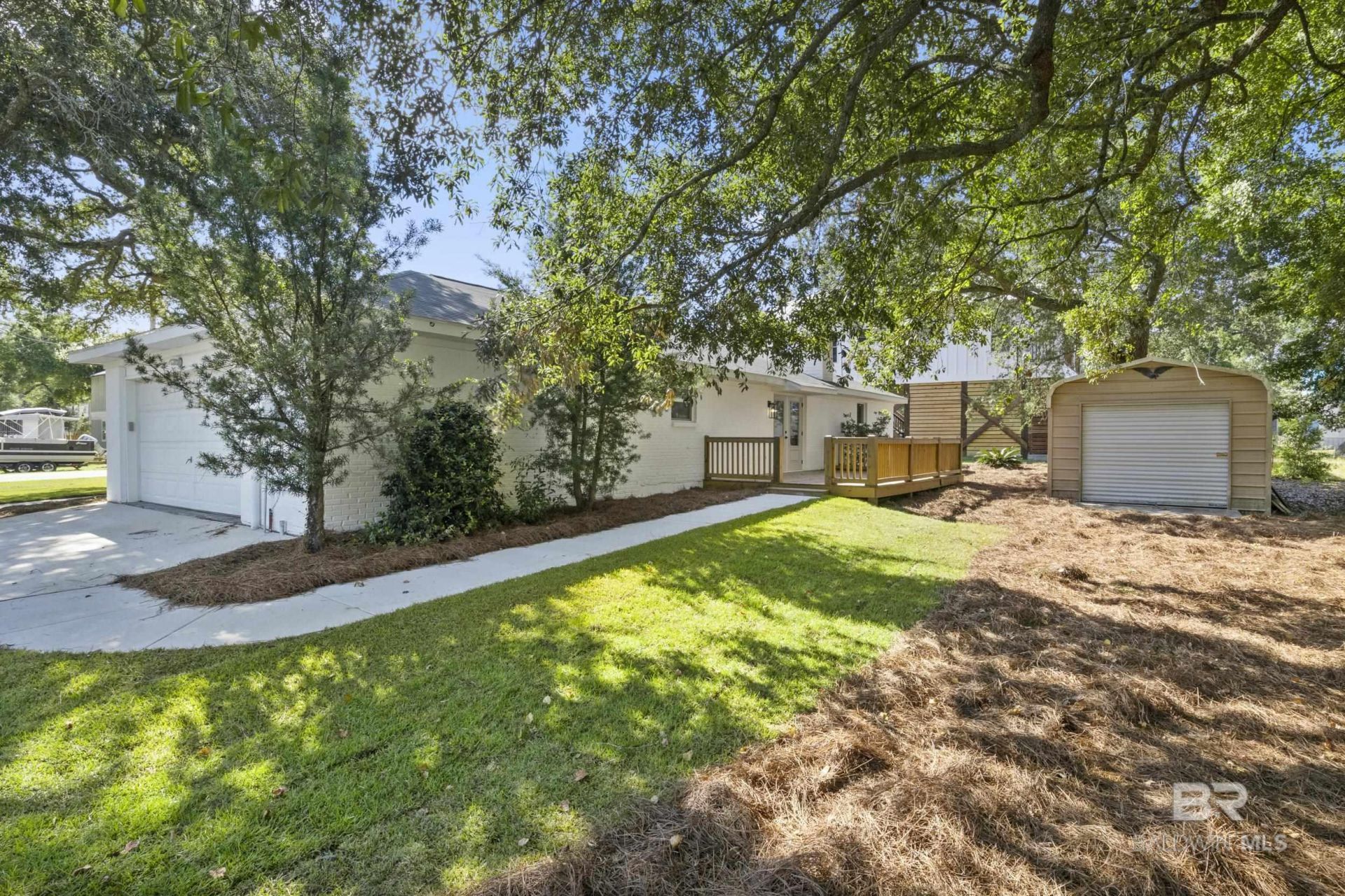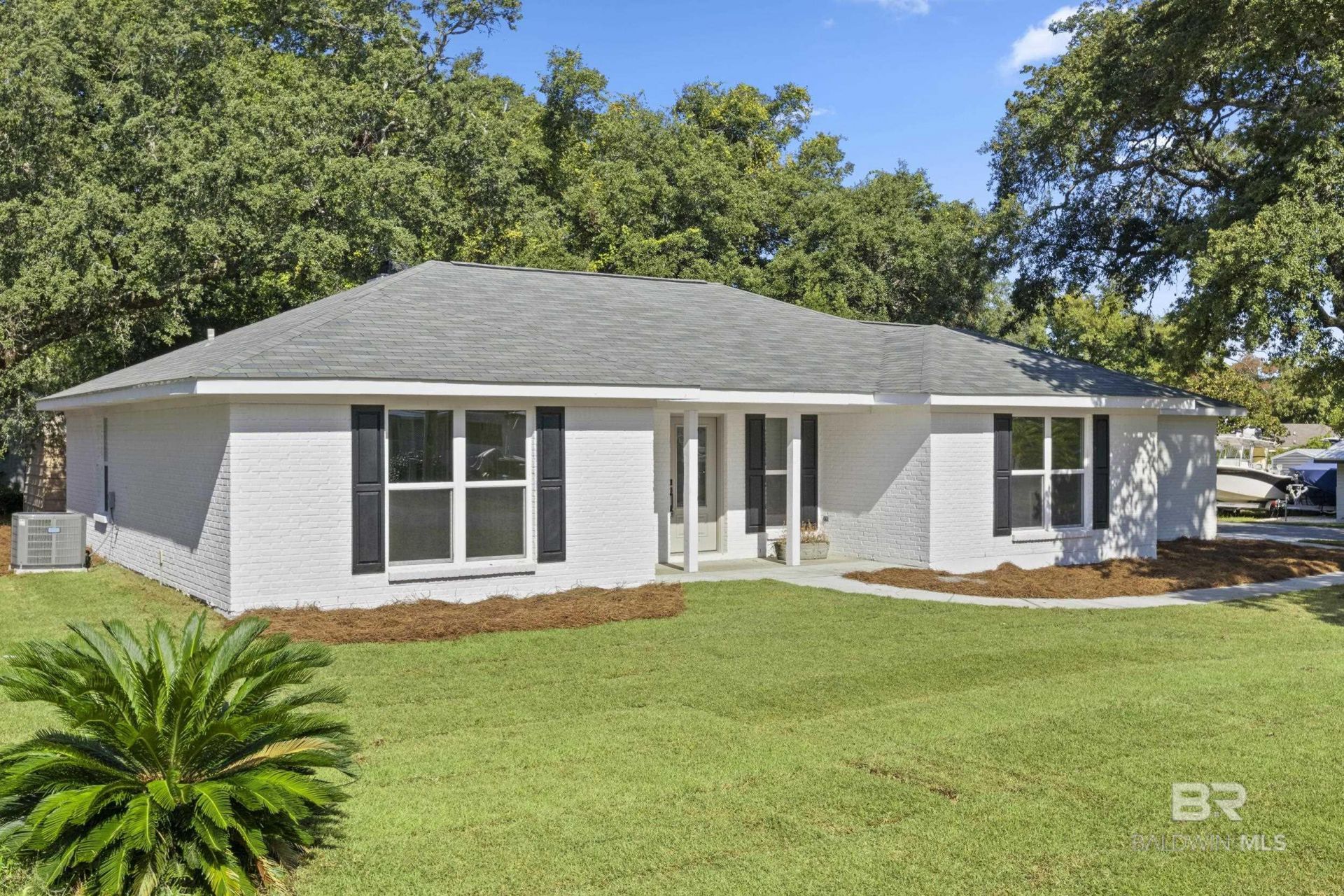 Fully renovated and tucked away in Bear Point Estates, this 3-bedroom ranch sits on a rare, private double lot (100x100) surrounded by mature trees and not in a flood zone. The backyard is built for entertaining, with an oversized deck, plenty of space to spread out, and an additional storage shed for all your extras.Inside, the home was completely updated in 2024 with a fresh, clean feel throughout. The kitchen features quartz countertops, painted shaker cabinets, and stainless steel appliances, opening into an oversized living area centered around a classic brick wood-burning fireplace. Luxury vinyl plank flooring runs throughout the entire home for a seamless, low-maintenance finish. The primary suite includes an updated bath with a tiled shower and quartz countertops.Major updates include a new roof (2022), HVAC (2022), and all new windows and doors (2024) for improved energy efficiency.Located in one of Orange Beach's most loved neighborhoods, Bear Point offers a true coastal lifestyle. Optional membership (just $350/year) gives you access to a private bayfront park, beach area, boat launch, and civic association amenities. Golf cart-friendly streets make it easy to cruise over to Bear Point Marina or grab dinner at OSO. This is a rare opportunity to own a move-in-ready home on a double lot in a highly sought-after community. Buyer to verify all information during due diligence.