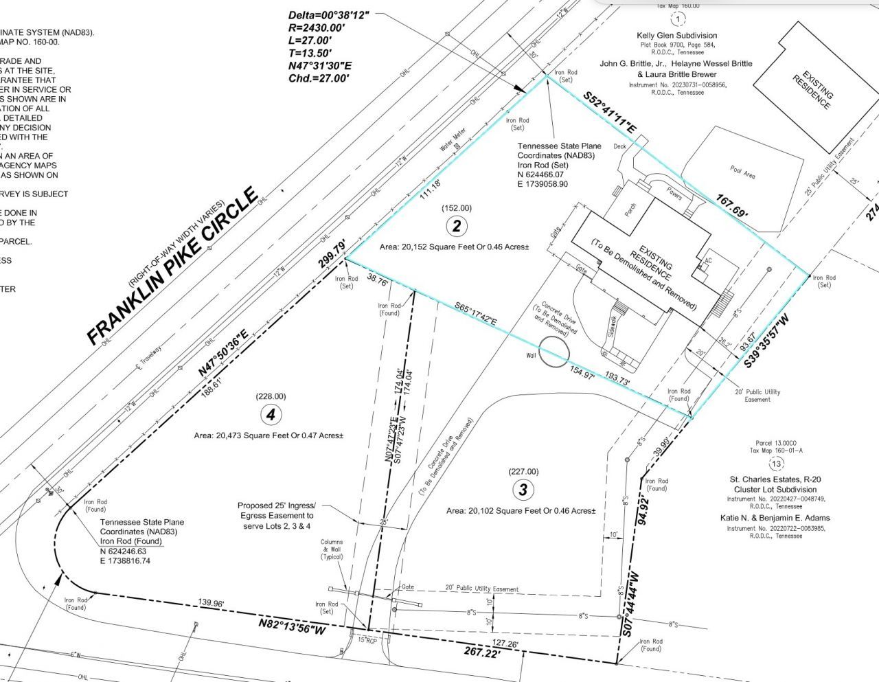 Lot 2 of the Kelly Glen Subdivision- a 20,000+ sqft R20-zoned lot at the corner of Franklin Pike Circle and Kelly Road. Build new construction in an established Brentwood corridor seeing active luxury development. Supports single or two-family development configurations, subject to Metro review and permitting. Adjacent lots also available individually or as a package deal. Buyer to verify all development feasibility, zoning, utilities, easements, and permitting with Metro.