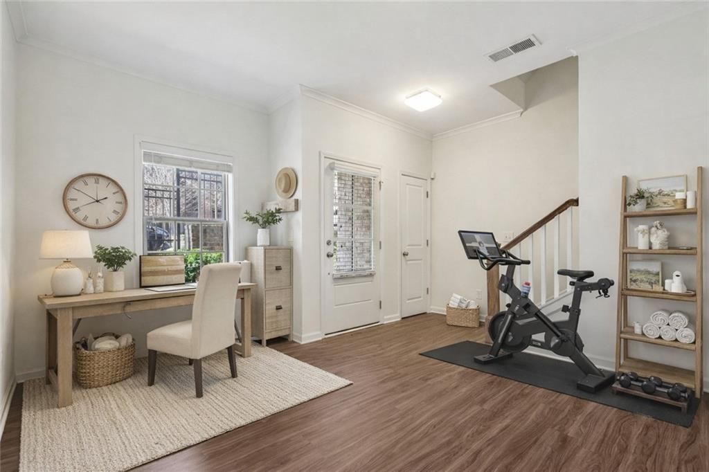 Gorgeous three-story, move-in ready townhouse in a gated community with tons of natural light and high ceilings! PRISTINE HOME priced to sell with extra features that include a $6500 custom Murphy bed with mattress, custom built-in's in the closets and pantry, newer stackable washer and dryer and refrigerator remain! The mounted 65 Visio TV included! Walls have just been freshly painted. Nothing to do but move in and enjoy. Beautiful flooring flows throughout ? no carpet! The lower level features a bright and welcoming flex space that can be used as a third bedroom, office or additional living space. Upstairs, the open concept family room offers a wall of windows, while the kitchen includes quartz countertops, breakfast bar, stainless steel appliances, electric stove, and a pantry. The spacious primary suite features dual custom closets and a fully tiled en-suite bath with frameless glass shower and bench. The secondary bedroom includes an en-suite bath, perfect for guests or an office. Upgrades include fresh interior paint, Ecobee thermostat, Ring doorbells at both entrances, HVAC compressor replaced in 2024. Prime location can't be beat - near Lindbergh MARTA, local dog park, Uptown Atlanta, Path 400, Piedmont Park, the Beltline, with easy access to highways including I-285, I-85, and GA 400. Modern, low-maintenance living in an unbeatable location - book your tour today!