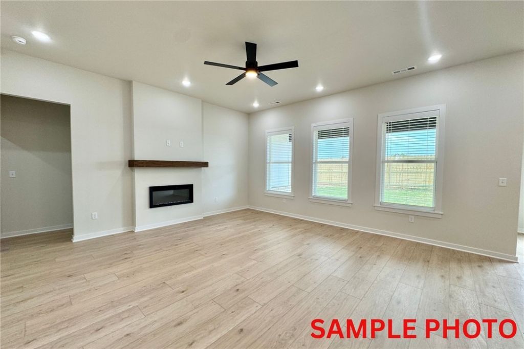 Fence, blinds and gutters included! Discover your dream home in the sought-after Osage Hills neighborhood. Arkansas plan with garage on the left and South facing! Pick your exterior and interior packages! 10 ft ceilings in the living/kitchen area, linear electric fireplace, 1 level, LVP flooring throughout the main living areas and primary bedroom, quartz countertops and more. Chef's kitchen boasting frigidaire stainless steel appliances, gas range, pantry, quartz countertops, bar pull handles, large island and gorgeous backsplash. Luxurious primary bedroom features abundant natural light, while the spa-like primary bathroom offers a walk-in shower, double sinks, and spacious walk-in closets. Additional features include two large secondary bedrooms and a separate laundry room. Nestled on a generous lot with covered patio that overlooks the serene sodded, fully fenced backyard. Sturdy concrete siding & brick! Model home located at 6008 SW Coywolf St- Lot 122.