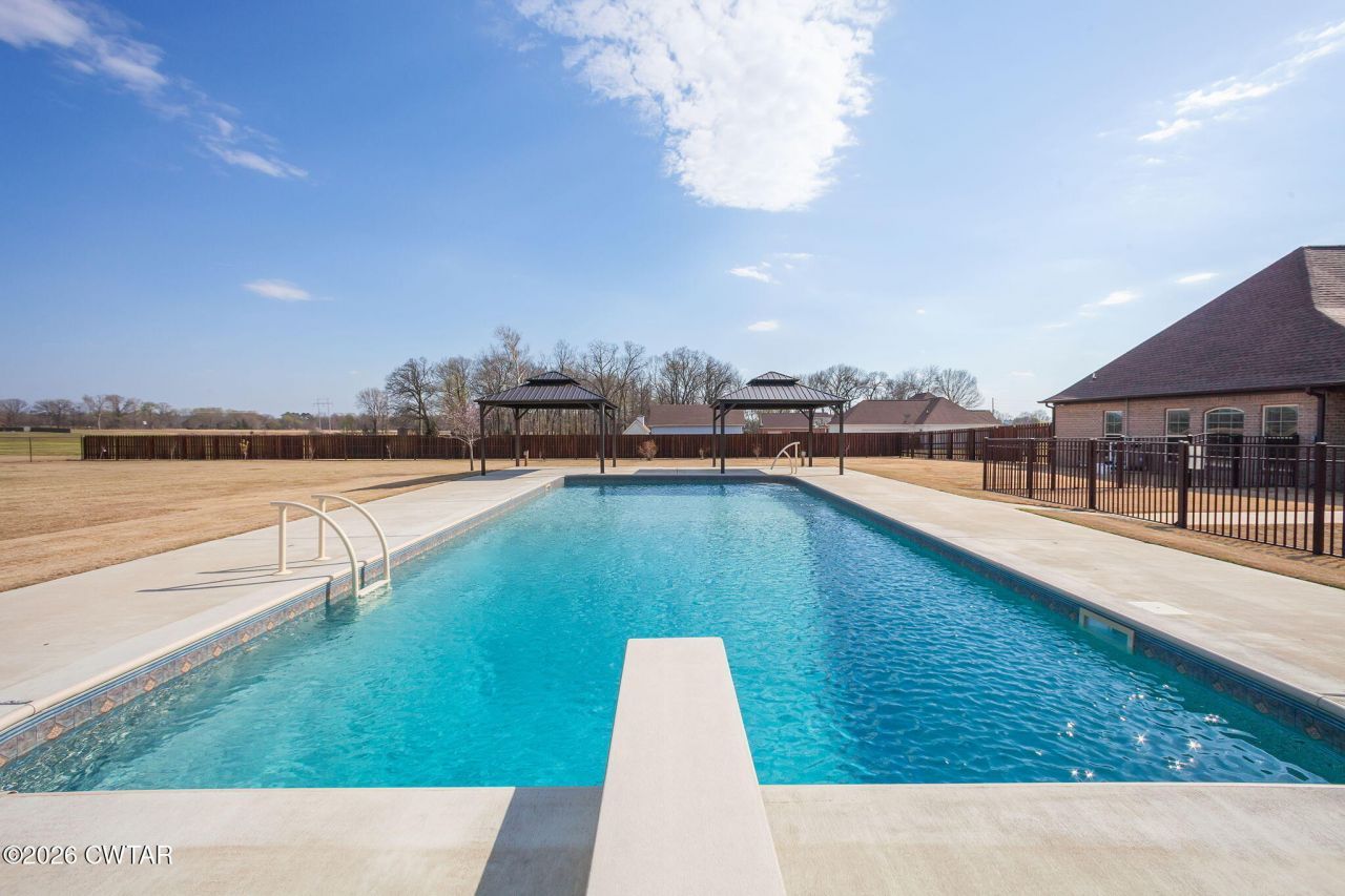 Step into your own private outdoor retreat on just under 4 beautifully maintained acres. The backyard features approx. 150' x 200' of fenced area designed for entertaining and everyday enjoyment, featuring an in ground 20x40 saltwater swimming pool installed in Fall 2024 with expanded concrete decking for generous gathering space. The custom concrete includes 4 built in umbrella holders, creating flexible shaded seating areas around and in the pool. Two gazebos overlook the pool area and are equipped with eight power outlets, making them ideal for outdoor dining, game days, evening lighting, or hosting events. The expansive yard offers room to play, garden, or simply enjoy the privacy and open space. Inside, the home offers 5 bedrooms and 4 full baths with tile flooring throughout. The kitchen provides abundant cabinetry, a double pantry, an eat in area, and a separate dining room. Just off the primary suite is a heated and cooled enclosed patio/sunroom for year round relaxation. The insulated garage includes a new HVAC unit and a storm shelter/safe room. A new roof was installed in December 2025 for added peace of mind. If outdoor living is at the top of your list, this property delivers space, function, and resort style amenities all in one.