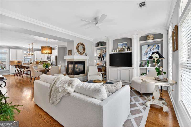 Immaculate, truly move-in ready townhome in the highly sought-after gated Jamestown community in South Forsyth! Providence Homes built this beautiful townhome This is low-maintenance living at its best... the HOA covers exterior maintenance, landscaping, roof, gutters, termite bond, trash, pool, tennis, pickle ball, and more-allowing you to simply enjoy your home without the hassle. Tucked away in a quiet, private setting, this home features real hardwood floors on both the main level and upstairs, creating a clean and cohesive feel throughout. The open floor plan offers a bright and functional layout, centered around a beautiful kitchen with solid wood cabinetry professionally painted, upgraded hardware, luxury lighting, and a touchless faucet. Small thoughtful touches like dimmer switches throughout and a double-sided fireplace (that also serves as a great heat source) make the home feel both elevated and comfortable. Upstairs, you'll find three bedrooms including a spacious primary suite with a custom walk-in closet and a well-appointed bath featuring dual sinks, soaking tub, and separate shower. The custom pantry and additional storage throughout add to the home's functionality. Enjoy your own private patio-perfect for relaxing or entertaining-along with a two-car garage featuring plenty of added storage. Guest parking is conveniently located directly behind the unit, making it easy for visitors. Jamestown offers resort-style amenities including a pool, tennis, pickleball, sidewalks, and beautifully maintained grounds. Ideally located just minutes from GA-400, Halcyon, Avalon, Downtown Alpharetta, and the Greenway trails. This is a completely Turnkey and low-maintenance townhome in an unbeatable location; this is one you don't want to miss!