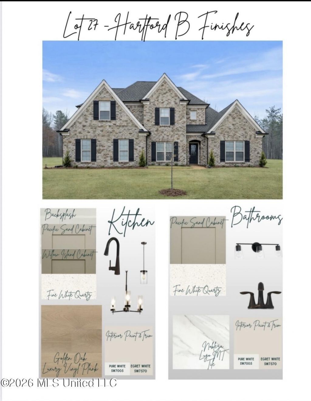 Our Hartford BW plan sits on an almost 2 acre lot and you will love the large Great Room with brick fireplace with gas logs. The beautiful open floor plan features a kitchen that includes a center island, tall upper cabinets with crown molding, soft close doors and drawers and quartz countertops. The appliance package includes stainless steel GE Smooth cooktop range (also option for gas range) with self cleaning oven , quiet dishwasher, built in microwave and disposal. The breakfast area is spacious and includes a large window for lots of natural light. There is also a spacious dining room that could also be used as a home office. The Master Suite is impressive and includes a trayed ceiling and relaxing bath with large walk through shower and stand alone soaker tub, a double sink vanity with quartz countertops, and two spacious walk in closets with wood shelving. The split bedroom plan has a bedroom and a full bath on the opposite side of the home allowing more privacy for the master suite. Luxury VInyl flooring flows through the entry hall, dining room, great room, kitchen, breakfast room, all bedrooms downstairs, downstairs hallways, and laundry room. Tile flooring is included in baths. Smooth ceilings, rounded corners, and crown molding plus laundry cabinets and wood stair treads are included. Upstairs there are two additional bedrooms, a full bath, and a bonus room with a closet (could also be a 5th bedroom) Additional features include quartz countertops in all baths, steel tub with tile surrounds, wood closet shelving, and covered rear porch. .Located just minutes from interstate 269 and convenient to Hernando, Southaven, and Tunica. ONLY COUNTY TAXES!!! Builder is offering up to $14,000 towards buyer's closing costs, with a preferred lender.