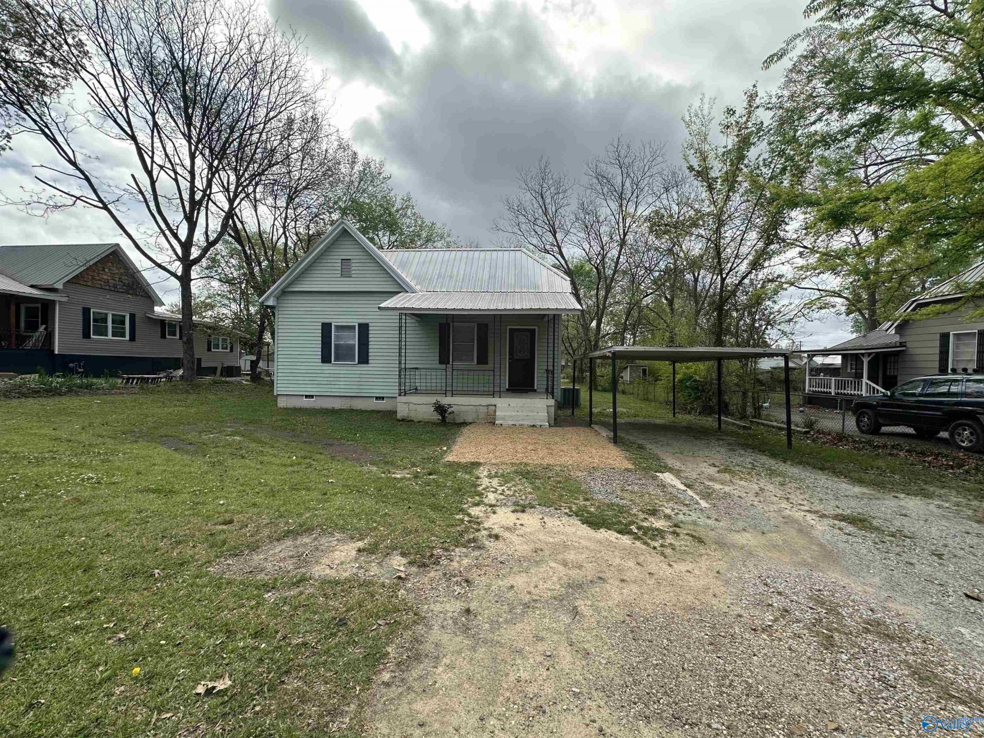 Alabama City-Charming starter home in the Mill Village! Features 2BR/1BA, LR Large Kitchen w/b-fast area, Large laundry or possible 3rd BR; central H/A; metal roof, covered front porch & back porch; carport; Large Lot, storage bldg in back. This one wont last long!!