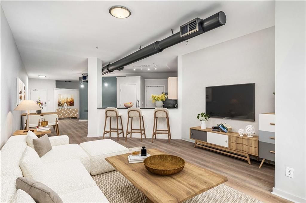 Midtown living, without compromise on space. Positioned along the Peachtree corridor at Cornerstone Village, this oversized one-bedroom residence offers a rare sense of volume and character in the heart of the city. With over 1,000 square feet, the home unfolds through an airy, open layout where exposed brick introduces warmth and texture, balanced by clean, modern finishes and generous natural light throughout. The interiors have been thoughtfully refreshed, featuring a renovated bath and a crisp, updated palette that creates a sophisticated, move-in ready feel. Whether hosting or unwinding, the scale and flow of the living spaces allow for a level of comfort not often found in Midtown condominiums. A deeded, covered parking space within a secured garage, conveniently located near the building entrance, enhances the ease of everyday living. Residents enjoy access to a robust collection of amenities, including a resort-style pool, fitness center, clubroom, private theatre, billiards lounge, and meeting spaces, all designed to extend the living experience beyond the home itself. Outside, Midtown's most sought-after destinations are just steps away. Dining, retail, and daily conveniences line Peachtree, while Piedmont Park, Colony Square, and the BeltLine offer a seamless connection to the neighborhood's vibrant energy. A distinctive opportunity to own a residence that prioritizes both scale and setting in one of Atlanta's most connected urban enclaves.
