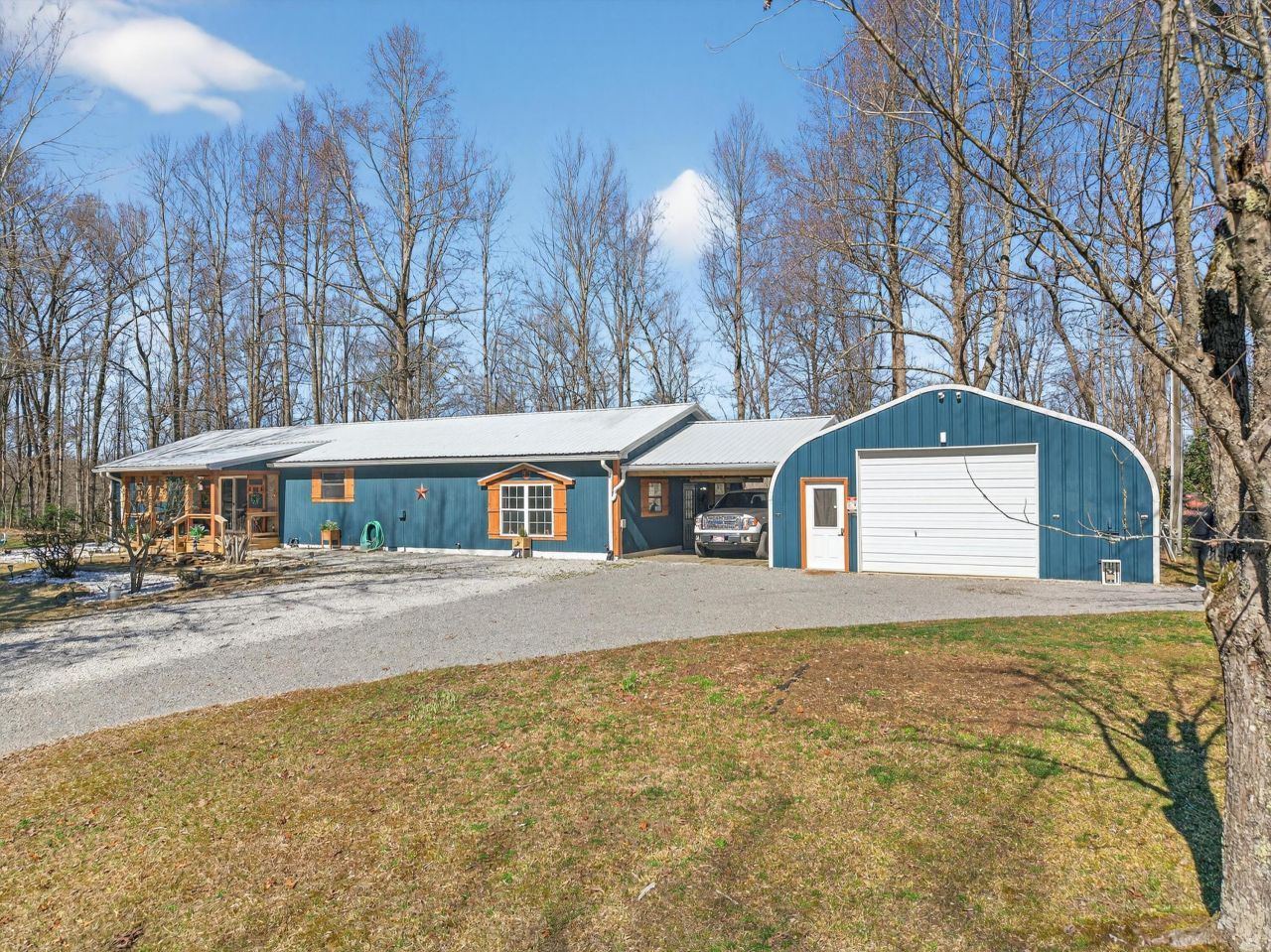 Situated on 13+ private acres with established trails, this property blends modern finishes with outdoor living. This home has split bedroom and open concept all on one level. Enjoy the spacious living area with built in entertainment center and 10ft ceilings. the home boasts luxury vinyl flooring throughout, granite countertops, and gas appliances. The sunroom features a built-in hideaway bed and wet bar for added flexibility. An expansive deck with covered grilling area overlooks the land. Also includes a large 2-car detached garage with 10 ft doors and an insulated outbuilding with power. This is the kind of property that gives you room to breathe, entertain and truly enjoy your land without sacrificing modern finishes and convenience. This unique property also features established ATV trails winding throughout the land. A peaceful creek also runs through the property adding relaxing natural beauty.