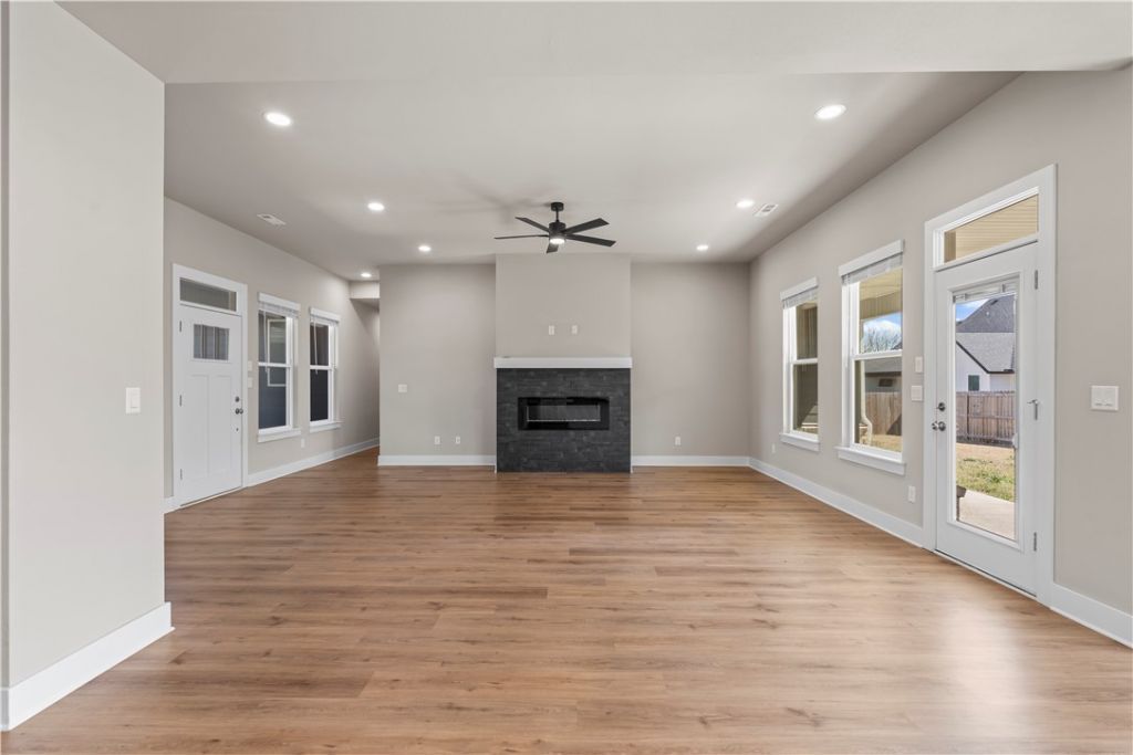 Beautiful Move in Ready Home in Wakefield Park! Spacious Open Floorplan and 4 Bedroom Layout! Home features include LVP Flooring, Granite Counters, Electric Fireplace, and Full Privacy Fencing. Foyer entry welcomes you into the large living space with great natural lighting and beautiful fireplace feature. The eat in kitchen has great workspace, including a gas cooktop and large pantry, refrigerator included! Dining space has large windows looking out to your backyard and access to the covered patio. Primary suite has tray ceiling detail and an attached bath with dual vanity, whirlpool tub, separate shower, and WIC. 3 guest bedrooms and 2 guest bathrooms offer great additional space for any buyer! 2 Car Garage. Located in a quiet new neighborhood across the road from state park. Nearby schools as well as shopping and dining and just 15 minutes to Fayetteville and I-49! Welcome Home!
