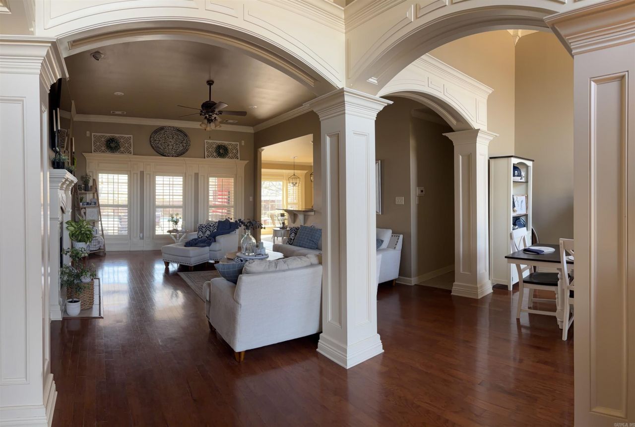Welcome to this beautiful 3-bedroom, 2-bath home located in a highly desirable golf course community just minutes from town. From the moment you enter, the home impresses with soaring ceilings, rich hardwood flooring, extensive crown molding, and elegant architectural details throughout. The spacious living area flows seamlessly into the well-appointed kitchen featuring solid surface countertops, stainless steel appliances, abundant cabinetry, and a generous pantry???perfect for both everyday living and entertaining. Thoughtful built-ins add charm and functionality, and the washer, dryer, and refrigerator convey, making this home move-in ready. Step outside to your private backyard oasis where the stunning in-ground pool becomes the centerpiece of outdoor living. Surrounded by beautiful landscaping, the pool features a newer liner and provides the perfect space for relaxing, cooling off during the summer, or entertaining family and friends. A covered porch with a pergola extension offers additional shaded seating and the ideal place to enjoy peaceful mornings or evening gatherings. Additional highlights include a side-entry garage and an updated high-efficiency.