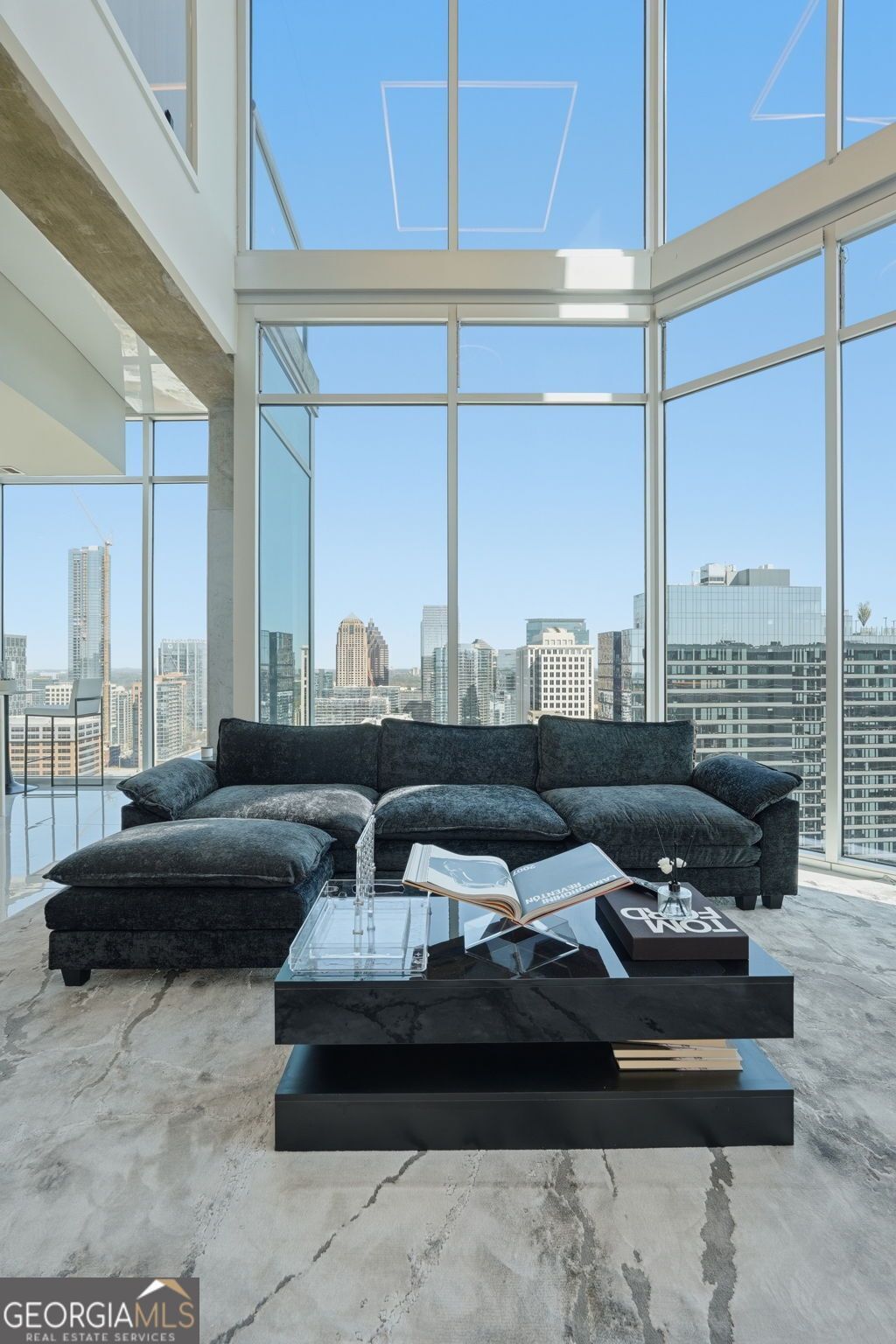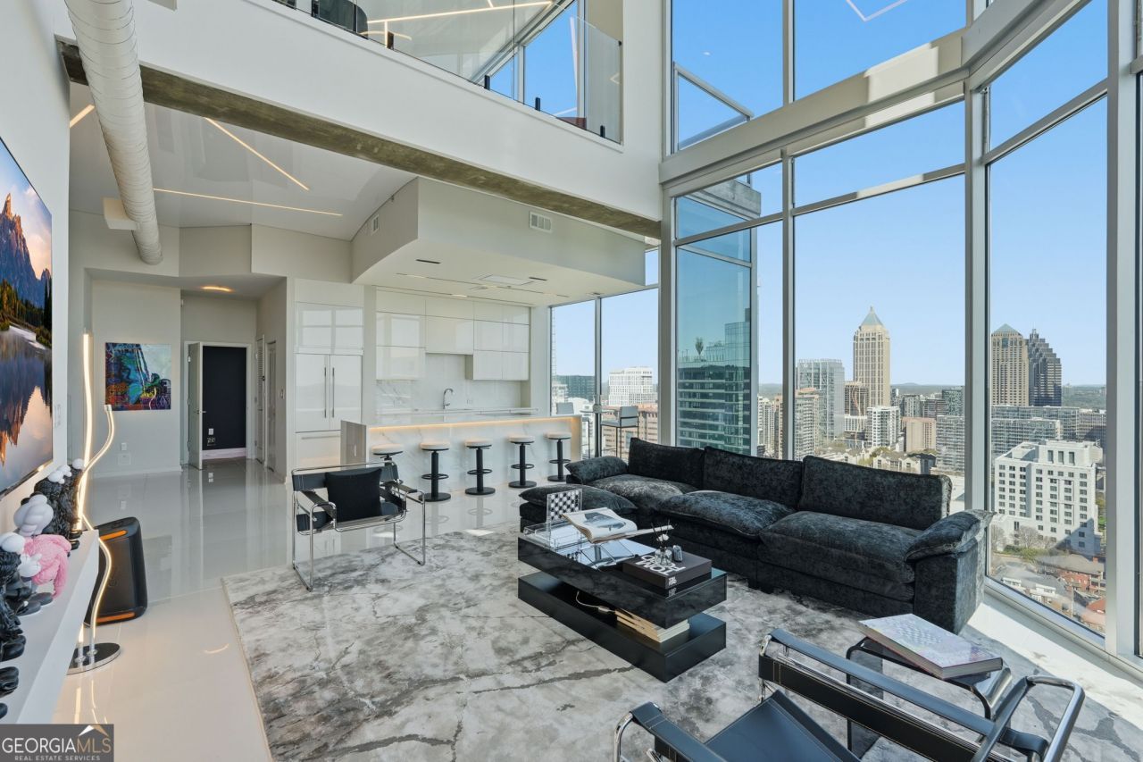 Iconic Penthouse Living in the Heart of Midtown! Perched high above Peachtree Street, this architecturally striking penthouse delivers a rare blend of modern design, dramatic scale, and breathtaking panoramic views of the Atlanta skyline. From the moment you enter, you are greeted by soaring double-height ceilings, expansive walls of glass, and a sculptural floating staircase with glass railings and integrated lighting. Natural light pours through every corner of the home, reflecting off sleek high-gloss flooring and creating a bright, gallery-like living experience. The chef's kitchen is a true showpiece, featuring custom high-gloss cabinetry, an oversized waterfall island, premium appliances, and uninterrupted skyline views that make everyday living feel elevated. The open-concept design flows seamlessly into the living and entertaining spaces, framed by floor-to-ceiling windows that capture stunning city vistas from every angle. The primary suite offers a private retreat in the sky, complete with breathtaking views, custom lighting, and a spa-inspired bath featuring dual vanities and a frameless glass shower. Additional living spaces include a dedicated office and thoughtfully designed guest accommodations, all finished with the same modern sophistication. Set within one of Midtown's premier high-rise buildings, residents enjoy unparalleled walkability to Atlanta's top dining, shopping, and entertainment. This is more than a residence. It is a lifestyle above the city.