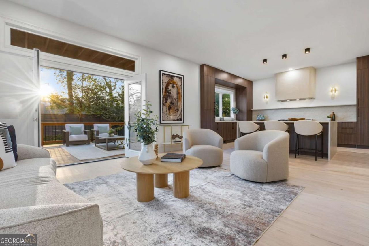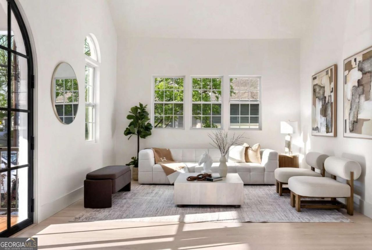 873 Monroe Circle NE is a rare Midtown offering where thoughtful design, natural light, and unmatched walkability converge. Set on the quiet curve of Monroe Circle, distinctly removed from the energy of Monroe Drive, this fully renovated farmhouse pairs modern architecture with classic Intown character. From the moment you enter, the scale is unexpected: soaring 20+ foot ceilings, a dramatic floor to ceiling linear fireplace, and a full wash of southern light create a living space that feels both expansive and grounded. At the center of the home, the kitchen is equal parts statement and function. A sculptural waterfall edge Taj Mahal quartzite island anchors the space, complemented by refined Maramont cabinetry, a hand troweled microcement hood, and stone surfaces that extend seamlessly into the backsplash. The kitchen is anchored by a professional-grade ZLINE range, blending performance with refined design. Thoughtful details, including an appliance garage, all drawer base cabinetry, and a utility faucet, elevate everyday use, while east facing light brings warmth into the space each morning. Hardwood floors run continuously throughout, reinforcing a sense of cohesion across all levels. The main floor offers a flexible bedroom and a fully realized bath with an integrated stone sink, linear drain, and full height tilework, equally suited for guests or a private office. Upstairs, two additional bedrooms share a well appointed bath, while skylights and seasonal skyline views introduce light and dimension. The primary suite is a true retreat, featuring a fireplace and a newly constructed upper level deck overlooking a private, fully fenced backyard with mature landscaping and curated stonework, offering a seamless indoor outdoor living experience. The spa inspired primary bath is beautifully appointed with an expansive walk in shower, a separate soaking tub, and a state of the art smart toilet for ultimate comfort and sophistication. A top level bonus space with its own full bath provides a quiet retreat ideal for work, media, or creative use, all framed by elevated rooftop views. Beyond the fence, a rare and defining feature: direct gated access to Midtown Promenade, placing Trader Joe's, dining, cinema, the BeltLine, and Ponce City Market just steps away. The connectivity is exceptional, yet the setting remains quiet and residential. Completed with arched steel and glass entry doors, new Hardie plank siding, updated systems, and curated exterior lighting, this is a home that balances design and livability in one of Atlanta's most dynamic neighborhoods.