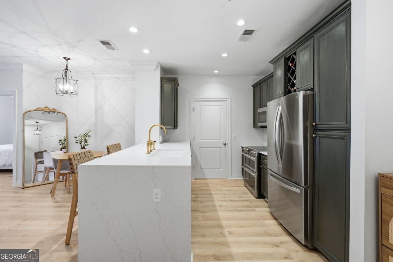 The ONLY available Serrano Condo with a Rare Double-Door Balcony Opening and Designer Kitchen. Welcome to this beautifully updated 2-bedroom, 2-bath residence in the highly sought-after Serrano Condominiums, ideally located in the heart of Sandy Springs. This is the only unit in the building featuring a true double-door balcony opening, allowing both doors to fully open and create a seamless indoor-outdoor living experience-an incredibly rare architectural detail that truly sets this home apart. Thoughtfully updated where it matters most, the home showcases brand-new wide-plank luxury flooring and a designer kitchen complete with quartz countertops and upgraded Cafe appliances-offering a level of finish not commonly found in other units. The split-bedroom layout provides optimal privacy, while the spacious primary suite features a walk-in closet and a well-appointed bath. Additional highlights include a private in-unit laundry room, a rare dedicated storage unit, and covered garage parking. Residents enjoy resort-style amenities including concierge service, a 24/7 fitness center, pool, sauna, theater room, and clubroom-delivering a true lock-and-leave lifestyle. Ideally situated within walking distance to local favorites like Yalda and Kale Me Crazy, with easy access to GA-400, I-285, and the Perimeter business district. Move-in ready and truly one-of-a-kind, this residence offers a rare opportunity to own a uniquely designed home in Serrano. Schedule your private showing today.