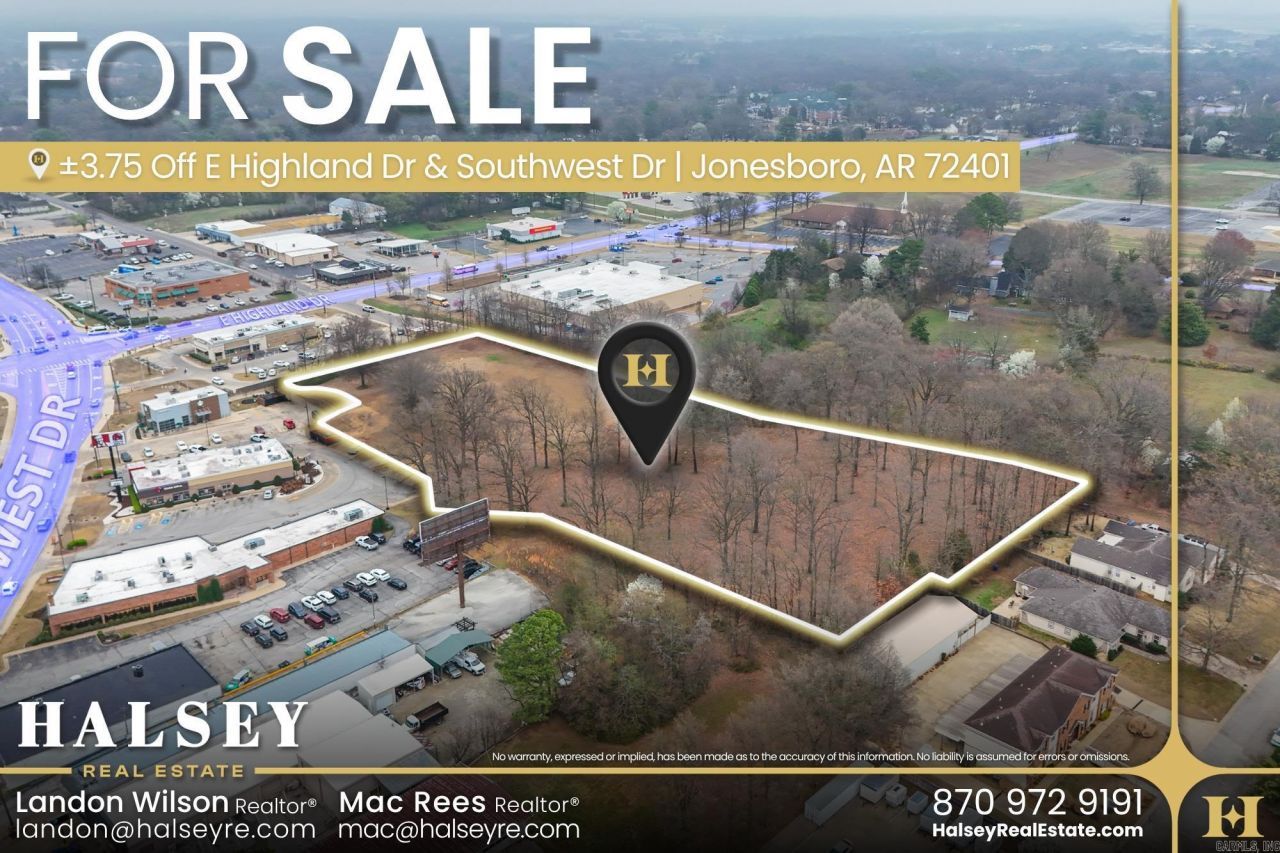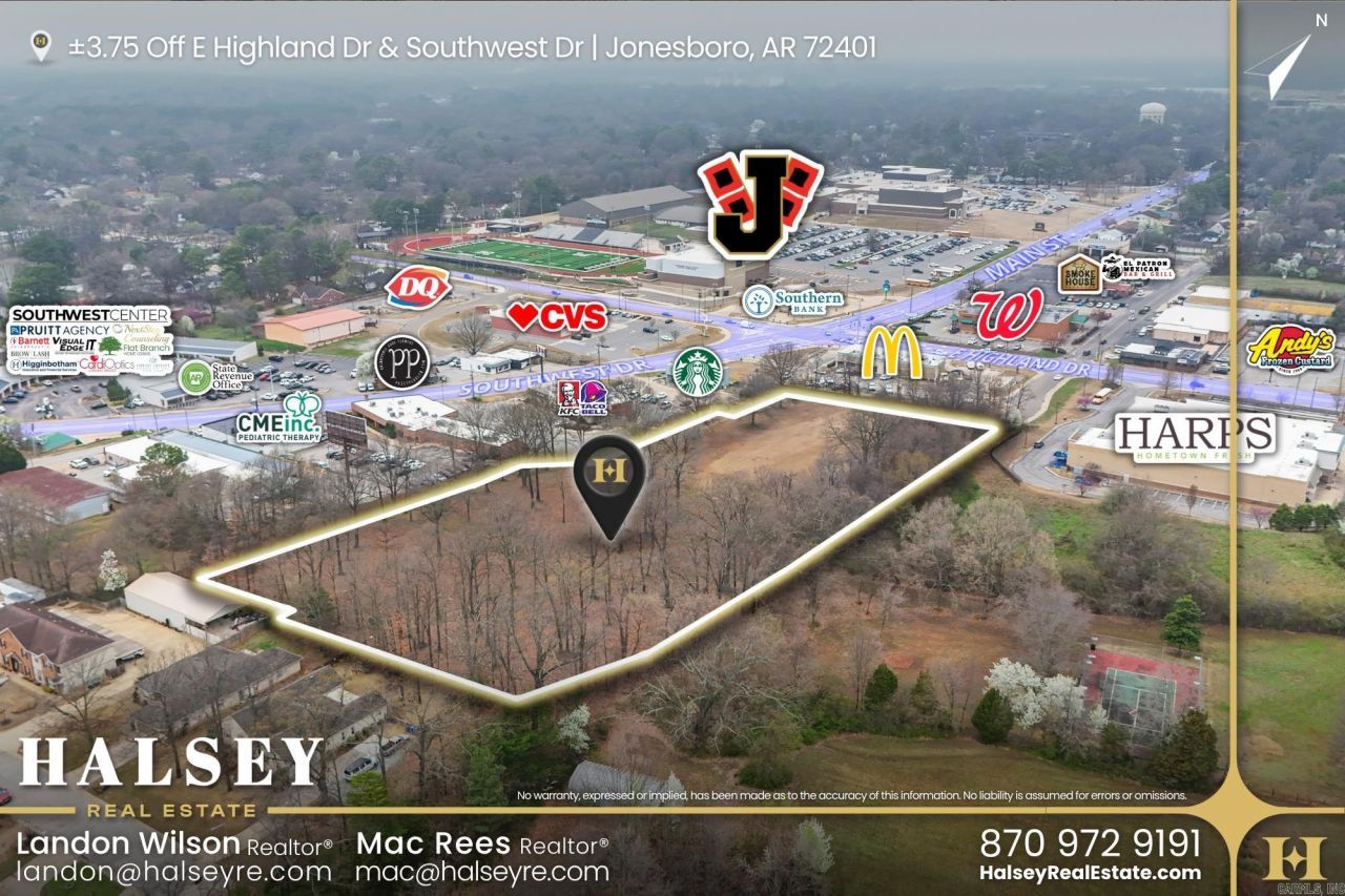 This ±3.75-acre tract just off E Highland Drive and Southwest Drive sits in a proven commercial pocket of Jonesboro where retail, service, and residential uses naturally converge. The site is tucked just off the main corridor, giving it accessibility - ideal for a range of development types. The split C-3 and R-2 zoning opens the door for multiple paths forward, whether that???s a commercial concept, residential use, or a combination of both. The layout and depth of the site allow for thoughtful design. What sets this location apart is how established the surrounding area already is. Traffic is consistent, rooftops are in place, and the surrounding businesses aren???t speculative???they???re operating and drawing daily activity. That foundation reduces the guesswork and supports long-term viability. The combination of location, zoning flexibility, and surrounding activity makes this a well-positioned site for a range of development uses within an established area of Jonesboro.